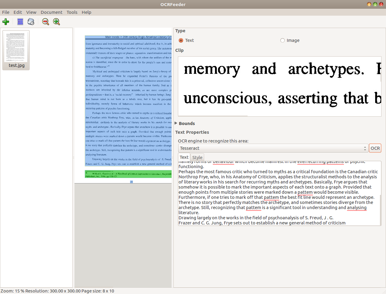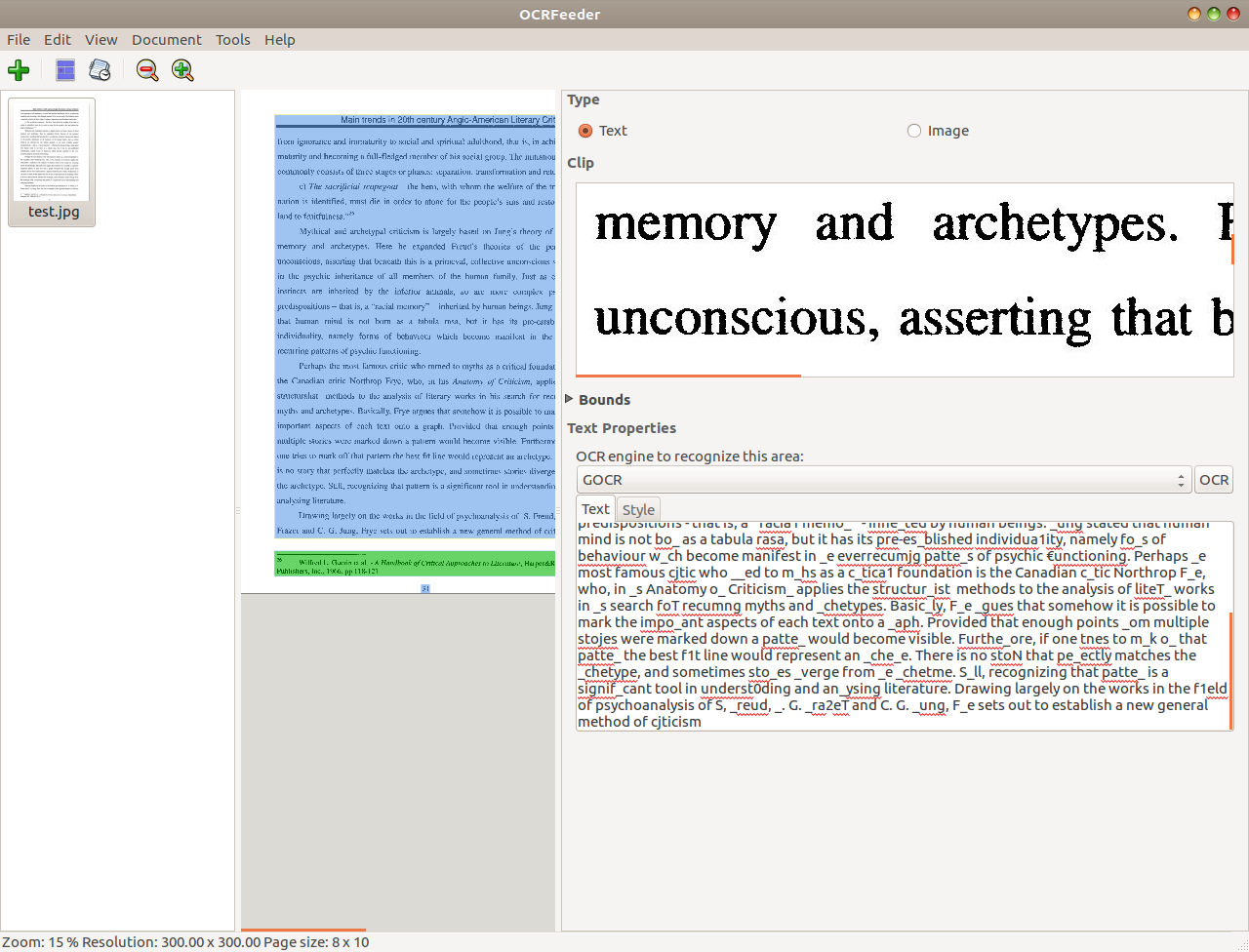 Testul a fost făcut pe o pagină A4 scanată la 300 dpi, text negru (8bit) pe o multifuncțională Lexmark X1270 (deci destul de veche). Am încercat mai multe tipuri de fișiere – jpg, bmp și png.